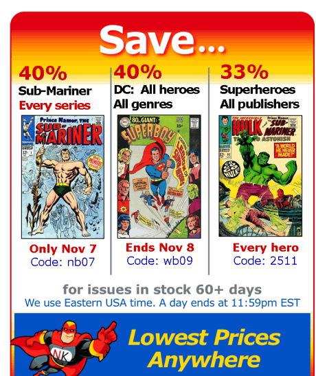 Lowest priced, discount comic books    As strange as it may sound, you help determine the price of every comic. That's because we drop the price of every comic every day it remains unsold. So, each time a book sells, some customer has determined its discounted price is worth buying it! If customers "pass" on a book, eventually some lower price will get it sold.