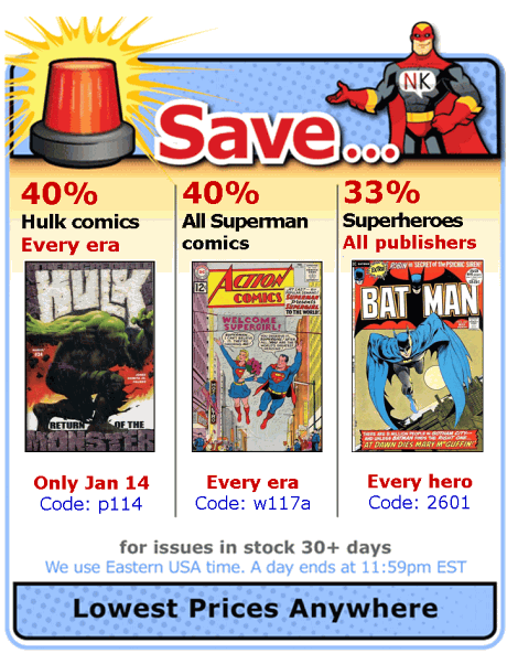 Lowest priced, discount comic books    As strange as it may sound, you help determine the price of every comic. That's because we drop the price of every comic every day it remains unsold. So, each time a book sells, some customer has determined its discounted price is worth buying it! If customers "pass" on a book, eventually some lower price will get it sold.