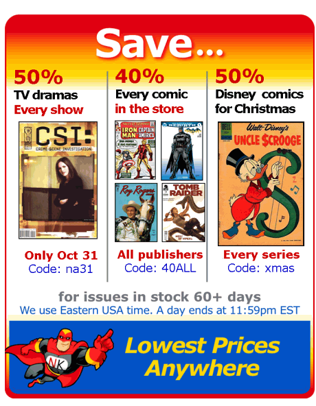Save 33% to 80% Every Day Five sales every day -- 33% to 80% off. And thousands of inexpensive comics! Get a $4 comic for under 75¢ each. We sell so many, we're happy with a tiny margin.