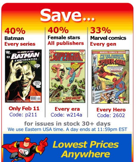 Lowest priced, discount comic books    As strange as it may sound, you help determine the price of every comic. That's because we drop the price of every comic every day it remains unsold. So, each time a book sells, some customer has determined its discounted price is worth buying it! If customers "pass" on a book, eventually some lower price will get it sold.