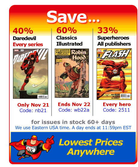 Lowest priced, discount comic books    As strange as it may sound, you help determine the price of every comic. That's because we drop the price of every comic every day it remains unsold. So, each time a book sells, some customer has determined its discounted price is worth buying it! If customers "pass" on a book, eventually some lower price will get it sold.