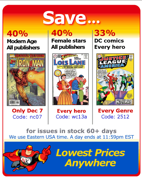 Lowest priced, discount comic books    As strange as it may sound, you help determine the price of every comic. That's because we drop the price of every comic every day it remains unsold. So, each time a book sells, some customer has determined its discounted price is worth buying it! If customers "pass" on a book, eventually some lower price will get it sold.