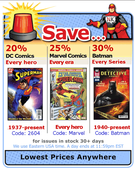 Lowest priced, discount comic books    As strange as it may sound, you help determine the price of every comic. That's because we drop the price of every comic every day it remains unsold. So, each time a book sells, some customer has determined its discounted price is worth buying it! If customers "pass" on a book, eventually some lower price will get it sold.