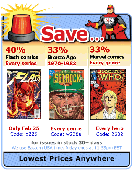 Lowest priced, discount comic books    As strange as it may sound, you help determine the price of every comic. That's because we drop the price of every comic every day it remains unsold. So, each time a book sells, some customer has determined its discounted price is worth buying it! If customers "pass" on a book, eventually some lower price will get it sold.