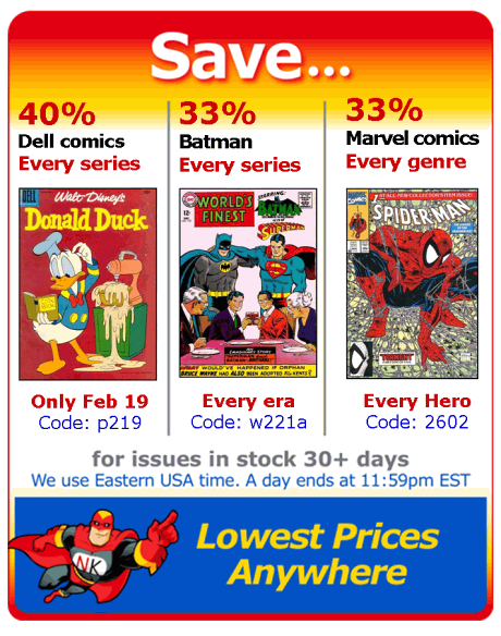 Lowest priced, discount comic books    As strange as it may sound, you help determine the price of every comic. That's because we drop the price of every comic every day it remains unsold. So, each time a book sells, some customer has determined its discounted price is worth buying it! If customers "pass" on a book, eventually some lower price will get it sold.