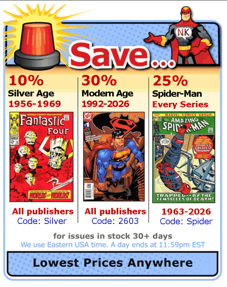 Lowest priced, discount comic books    As strange as it may sound, you help determine the price of every comic. That's because we drop the price of every comic every day it remains unsold. So, each time a book sells, some customer has determined its discounted price is worth buying it! If customers "pass" on a book, eventually some lower price will get it sold.