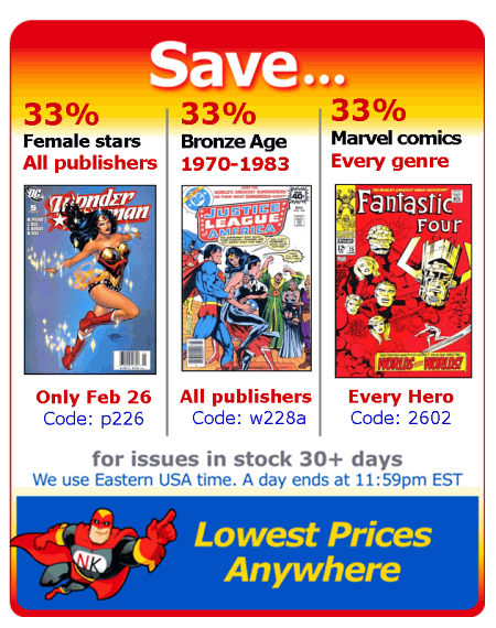 Lowest priced, discount comic books    As strange as it may sound, you help determine the price of every comic. That's because we drop the price of every comic every day it remains unsold. So, each time a book sells, some customer has determined its discounted price is worth buying it! If customers "pass" on a book, eventually some lower price will get it sold.