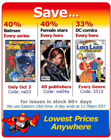 Lowest priced, discount comic books    As strange as it may sound, you help determine the price of every comic. That's because we drop the price of every comic every day it remains unsold. So, each time a book sells, some customer has determined its discounted price is worth buying it! If customers "pass" on a book, eventually some lower price will get it sold.