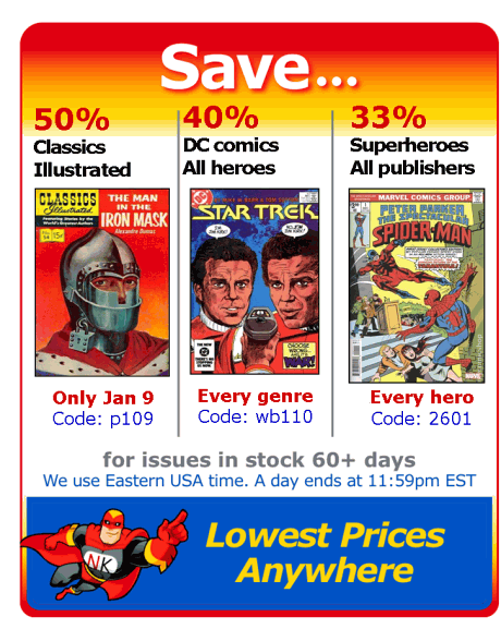 Lowest priced, discount comic books    As strange as it may sound, you help determine the price of every comic. That's because we drop the price of every comic every day it remains unsold. So, each time a book sells, some customer has determined its discounted price is worth buying it! If customers "pass" on a book, eventually some lower price will get it sold.