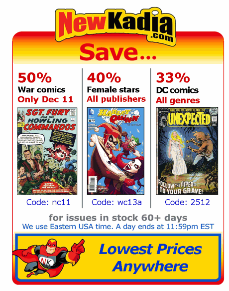 Lowest priced, discount comic books    As strange as it may sound, you help determine the price of every comic. That's because we drop the price of every comic every day it remains unsold. So, each time a book sells, some customer has determined its discounted price is worth buying it! If customers "pass" on a book, eventually some lower price will get it sold.