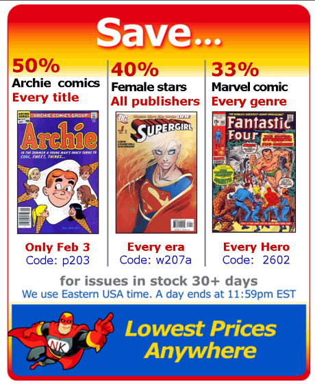 Lowest priced, discount comic books    As strange as it may sound, you help determine the price of every comic. That's because we drop the price of every comic every day it remains unsold. So, each time a book sells, some customer has determined its discounted price is worth buying it! If customers "pass" on a book, eventually some lower price will get it sold.